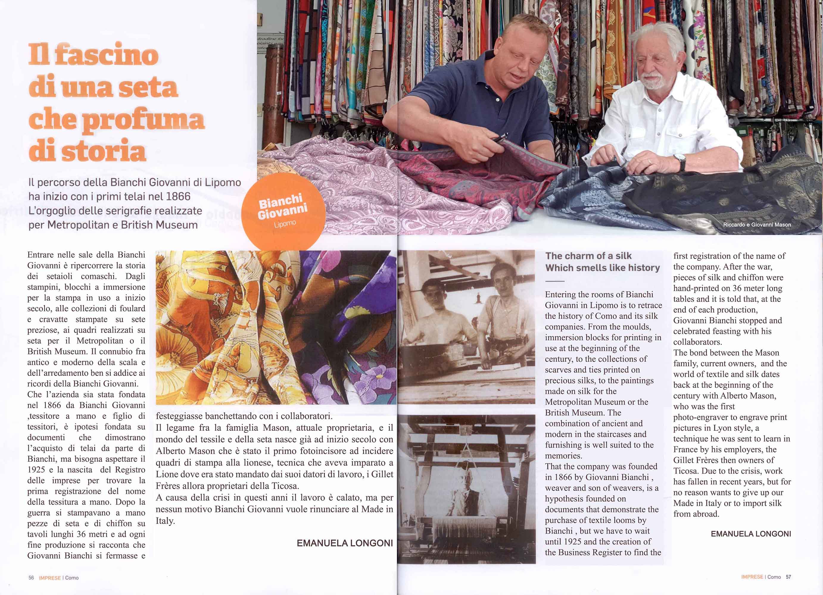 That the company was founded in 1866 by Giovanni Bianchi , weaver and son of weavers, is a hypothesis founded on documents that demonstrate the purchase of textile looms by Bianchi , but we have to wait until 1925 and the creation of the Business Register to find the first registration of the name of the company. After the war, pieces of silk and chiffon were hand-printed on 36 meter long tables and it is told that, at the end of each production, Giovanni Bianchi stopped and celebrated feasting with his collaborators.